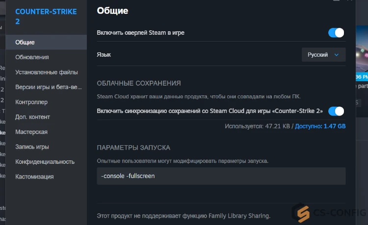 Добавить параметры запуска Counter-Strike 2 можно прямо в Steam. Для этого откройте библиотеку, найдите Counter-Strike 2, нажмите по игре правой кнопкой мыши и перейдите в раздел «Свойства». После этого в блоке «Общие» найдите строку «Параметры запуска» и вставьте туда нужные команды через пробел.