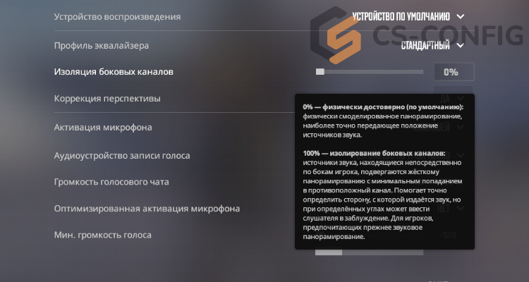 При значении 0% звук позиционируется максимально точно, но может показаться непривычным. Повышение значения делает звук более «мягким» и напоминающим CS:GO, но снижает точность. Если твоя цель - как улучшить звук в CS2 и слышать противников раньше, рекомендуется минимальная изоляция.