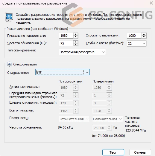 - В параметрах синхронизации выберите GTF и нажмите «Тест». Если изображение отображается корректно, сохраните настройки.