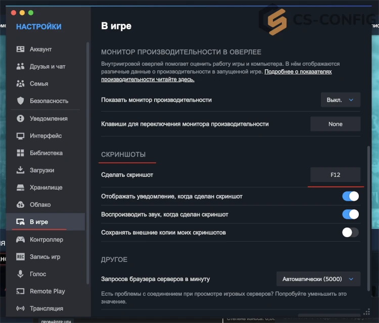 Вы также можете изменить кнопку для создания скрина в КС 2. Для этого зайдите в настройки Steam, перейдите во вкладку "В игре", после найдите раздел "Скриншоты" и измените кнопку на нужную вам: