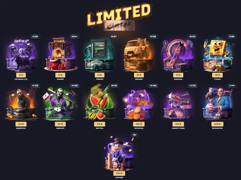Особое место занимают лимитированные кейсы, которые появляются на Skinbox редко, но метко! Эти кейсы доступны ограниченное время и отличаются редким содержимым. Они имеют счётчик открытий и когда показатель будет нулевой, кейс нельзя будет открыть.
