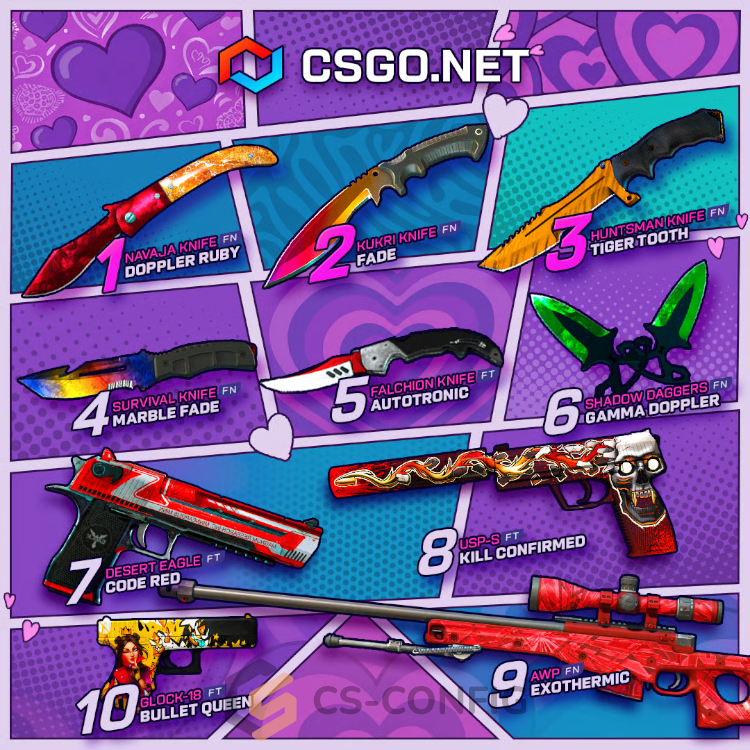 Призовой фонд Cupids Giveaway включает ножи CS2 с популярными и узнаваемыми скинами. В розыгрыше представлены как версии в состоянии Factory New, так и достойные варианты Field-Tested.