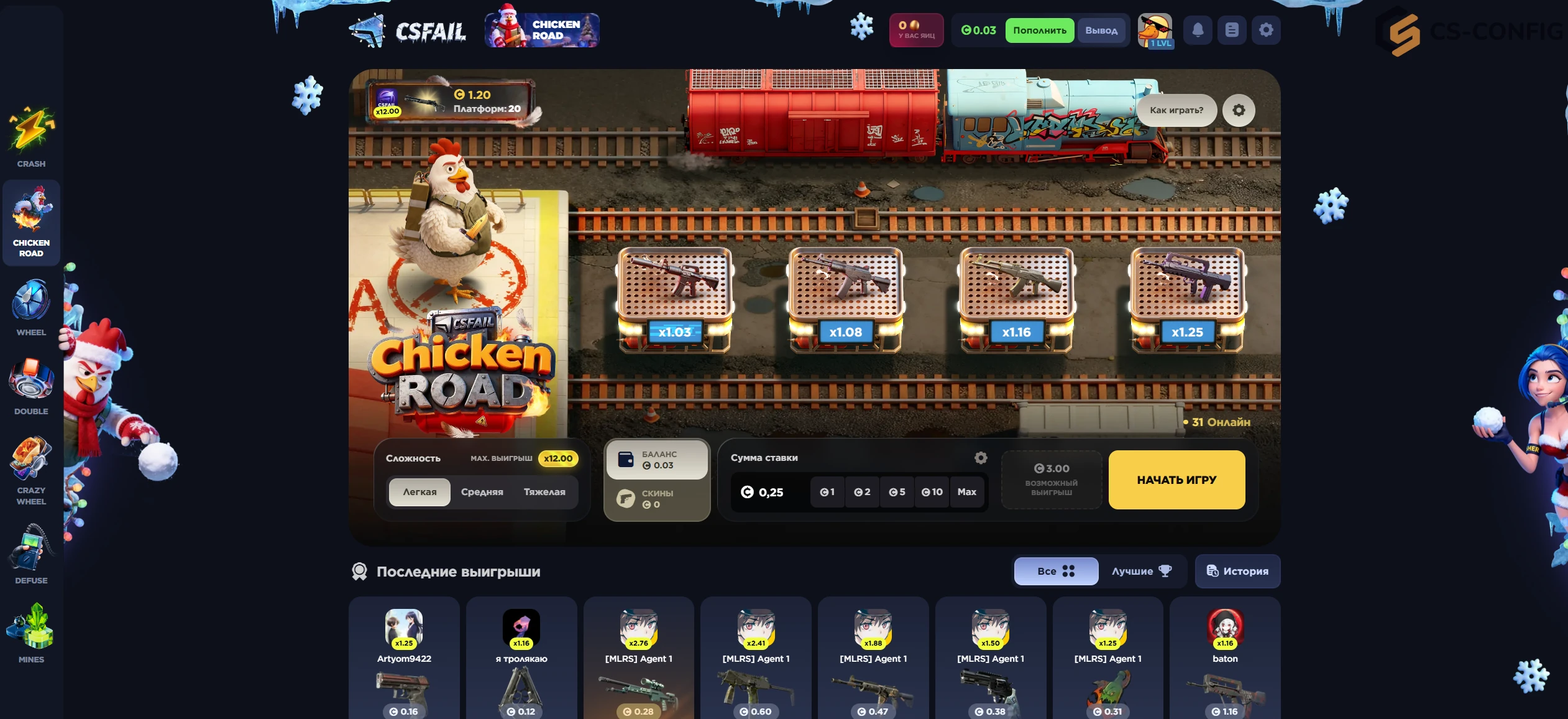 CS.FAIL - популярный сайт с мини играми CS2, который известен на весь мир. Сайт предлагает честную систему дропа, быстрые выплаты и большой выбор кейсов с ножами, перчатками и редкими скинами. Для новых пользователей доступен специальный промокод, позволяющий начать игру с дополнительным бонусом.