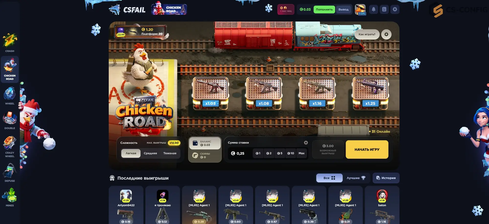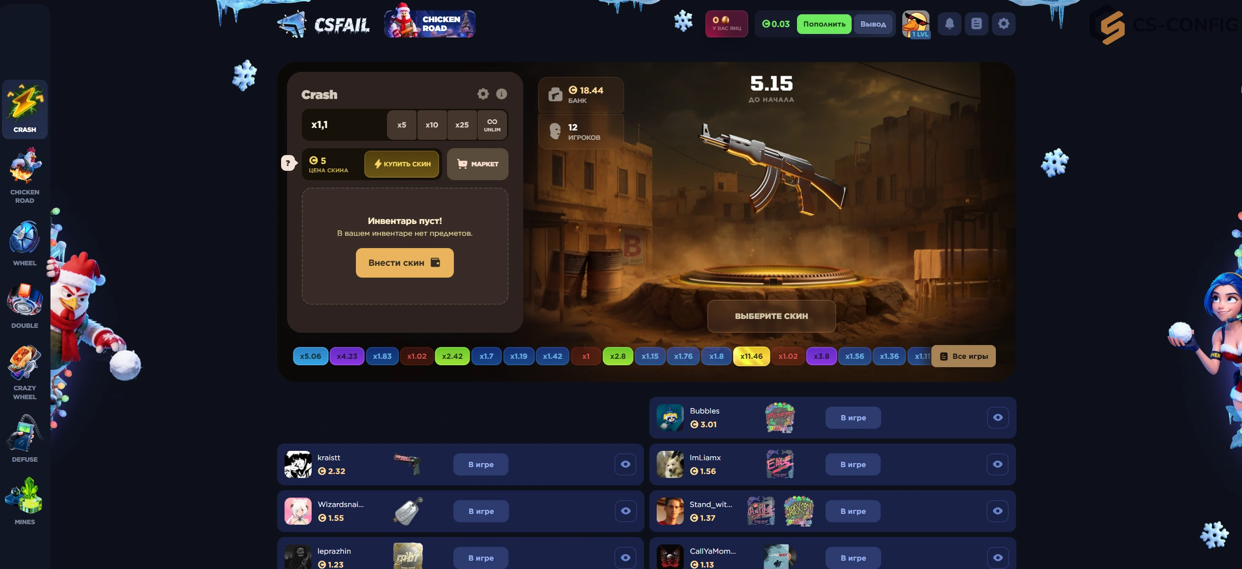 Если вы планируете играть на CS.FAIL, обязательно используйте актуальный промокод CONFIG. Он позволяет получить бонус к депозиту и бесплатные кейсы, что делает старт на фейле более выгодным. CS.FAIL - хороший выбор для игроков, которые ищут открытие кейсов CS2, краш сайт с высокими процентами и проверенный проект с честной системой дропа.