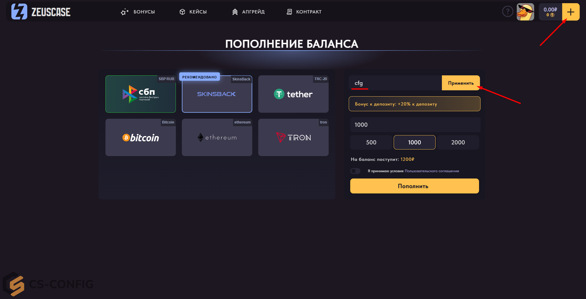 Промокод cfg для ZEUSCASE - бонус +20% и Подарок при регистрации