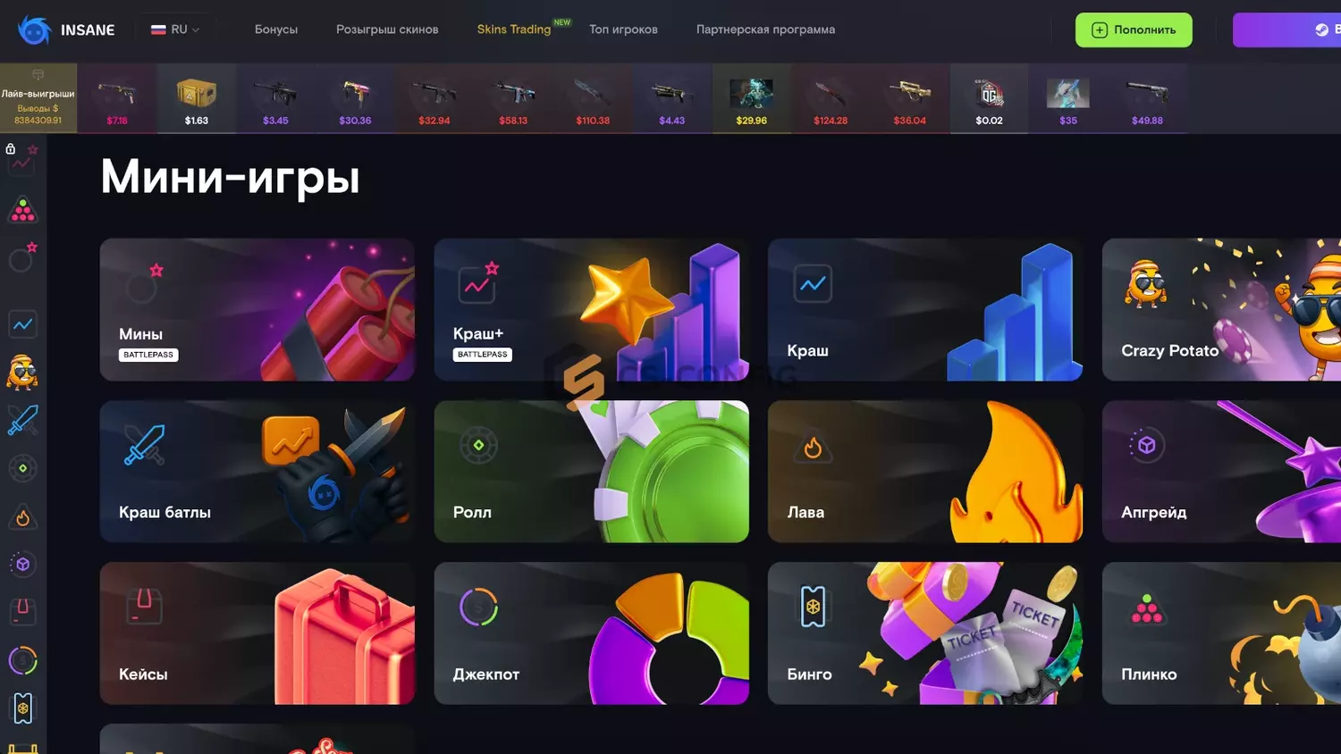 Insane - это популярная игровая платформа, где пользователи могут получить новые скины CS2, Dota 2 и Rust, участвуя в разнообразных играх. Помимо этого, сайт предлагает щедрые бонусы, уникальные события и реферальные акции, которые подойдут и новичкам, и опытным игрокам.