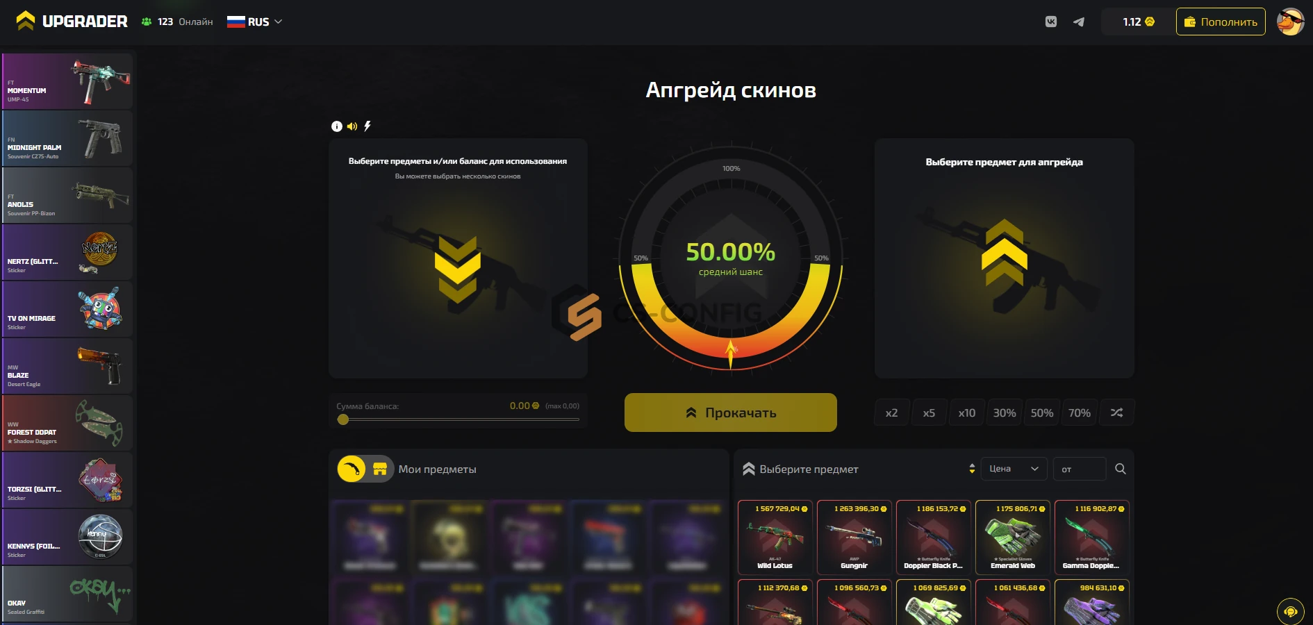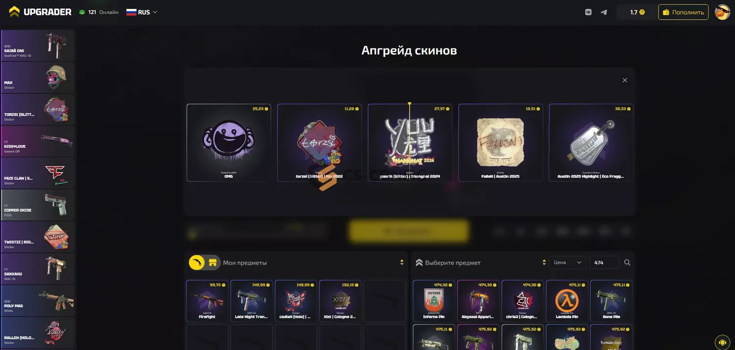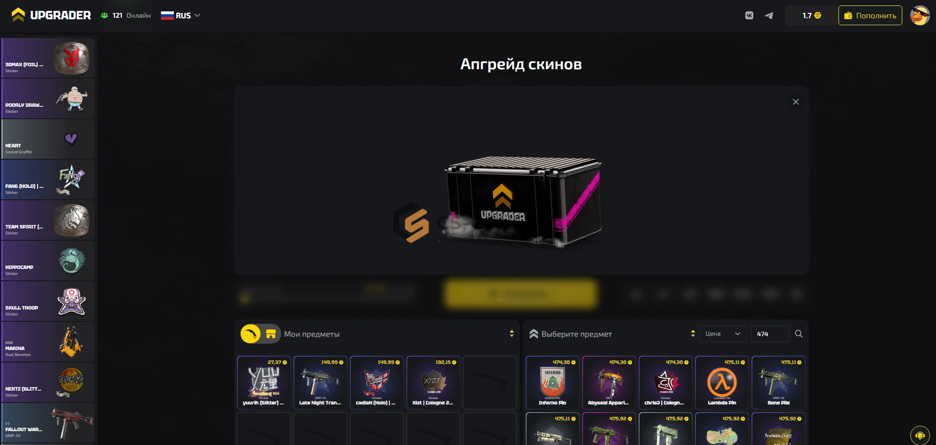 Апгрейдер про - это платформа, ориентированная на честный и математически прозрачный апгрейд скинов CS2. Высокий RTP до 99%, простота интерфейса и моментальные выводы делают сайт одним из наиболее надёжных и удобных вариантов для апгрейда инвентаря.