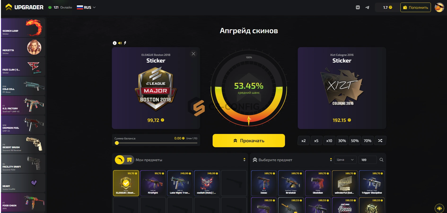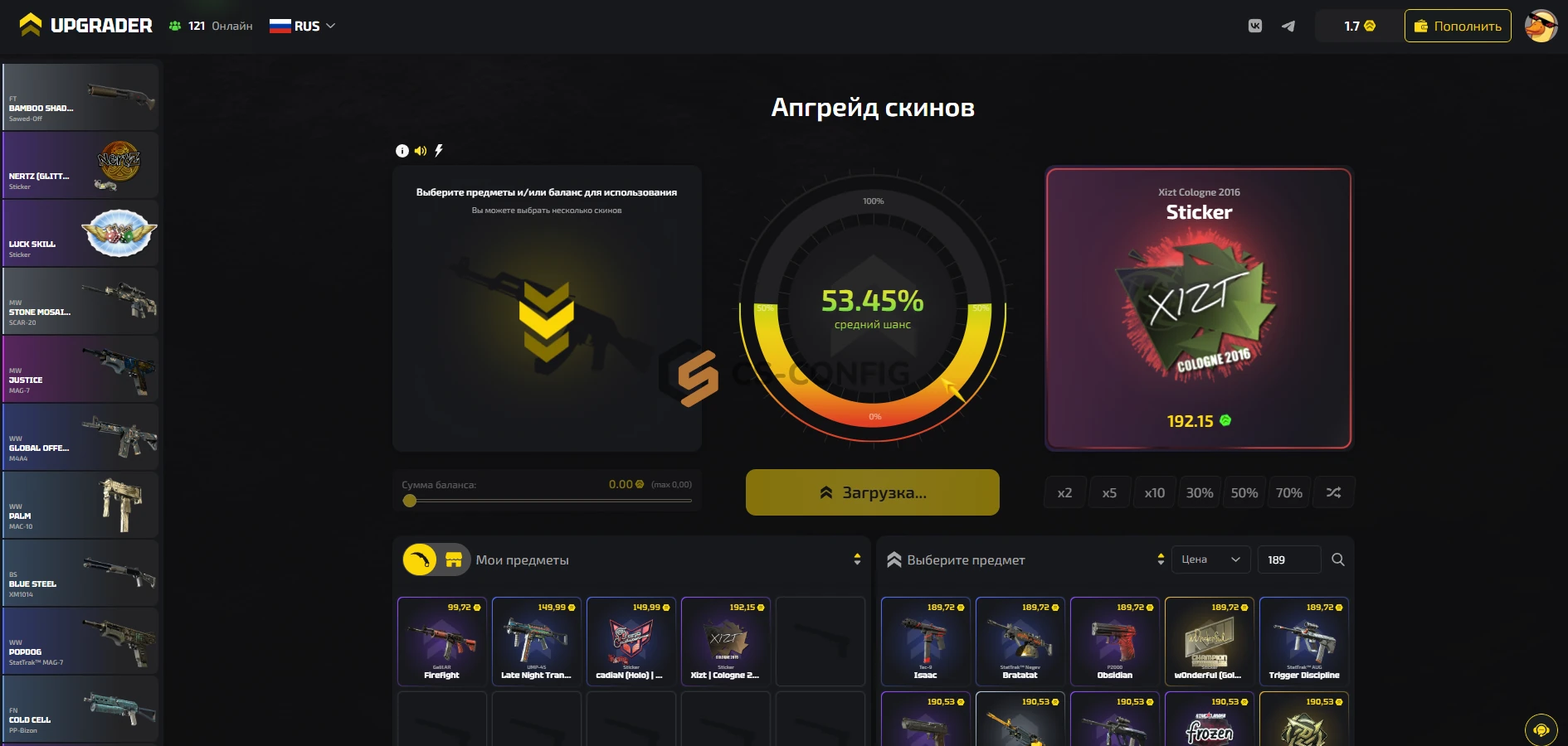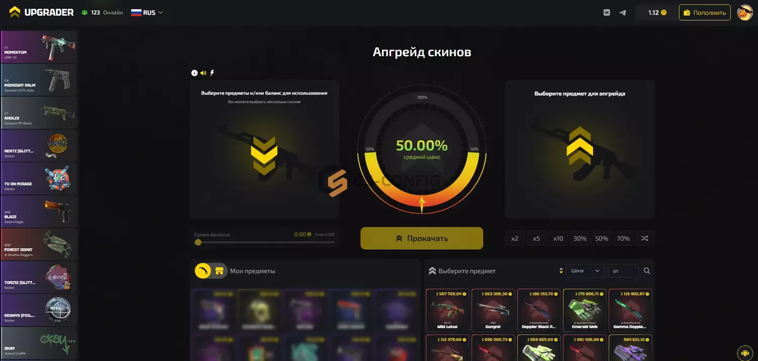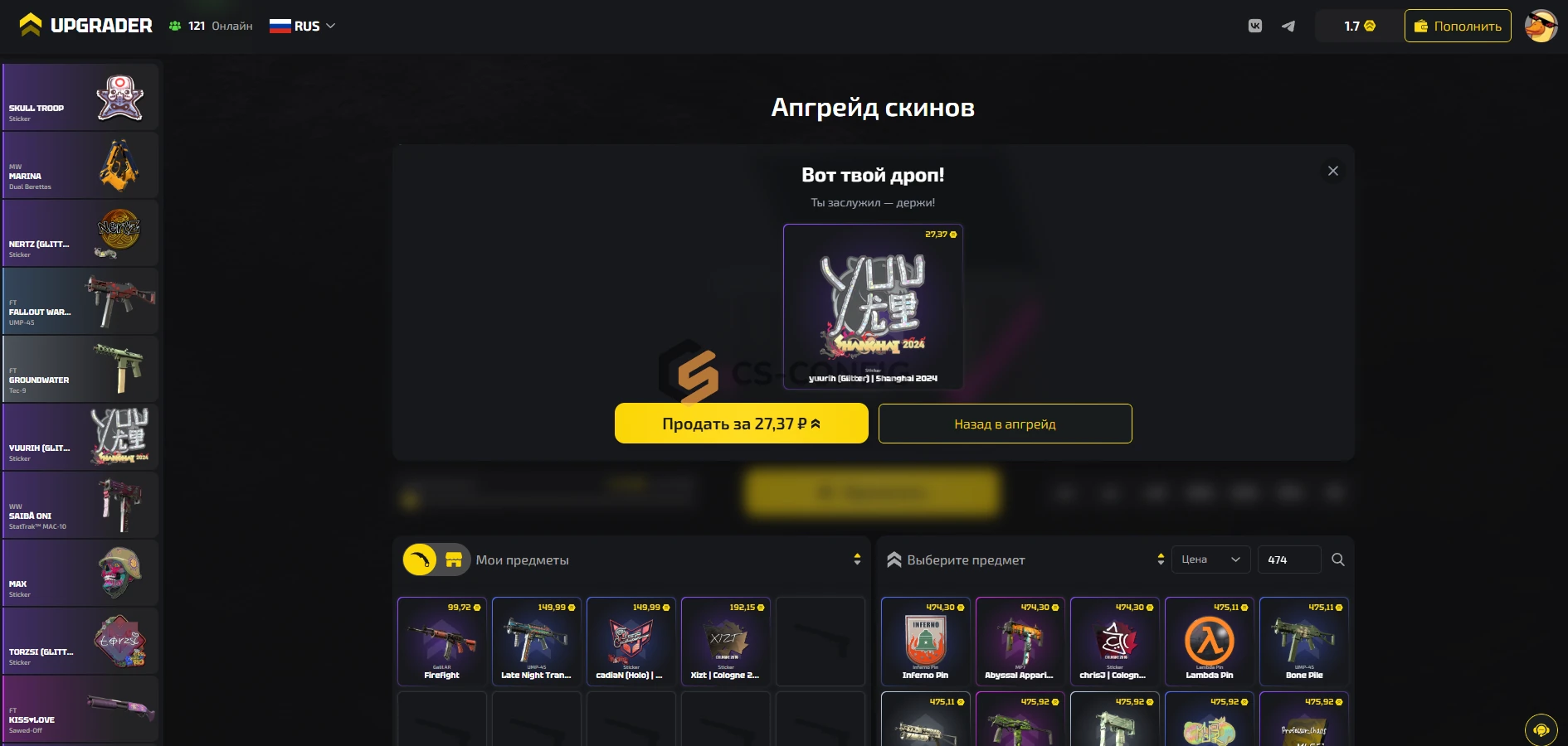 Апгрейдер про - это платформа, ориентированная на честный и математически прозрачный апгрейд скинов CS2. Высокий RTP до 99%, простота интерфейса и моментальные выводы делают сайт одним из наиболее надёжных и удобных вариантов для апгрейда инвентаря.